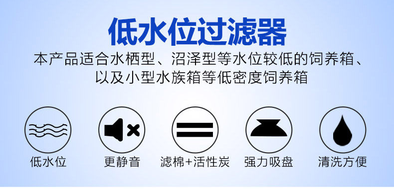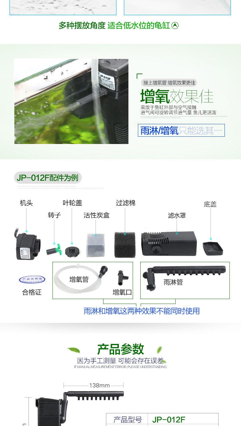 注意缸里有細(xì)沙的不能使用哦。HN白色款蕞低水位3-4cm,適用于烏龜缸,小型深水魚缸。靜音過濾,瀑布式出水。高水位可用掛鉤式固定,還可根據(jù)厚度調(diào)整。低水位可用吸盤固定吸附在缸壁上。JP系列黑色款蕞低水位3-4cm,龜缸使用側(cè)臥放置即可達(dá)到過濾增氧造浪功能,搭配雨淋管可造景增氧過濾非常美觀。過濾泵自帶活性炭板,快遞途中可能會有刮痕和滲出并不會影響使用。我們保證商品發(fā)出時(shí)是全新的,但難免會遇到上述問題。 親們一定注意,這個是迷您的過濾器,非常大龜缸尺寸建議不要超30CM,小型烏龜!如果太大會影響使用質(zhì)量 !