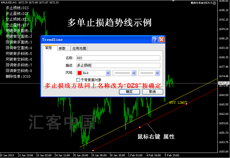 1:交易者根據當下K線之走勢,結合自己對趨勢的把握和預期,在預設的位置畫出一條或者多條趨勢線,畫好后,對準趨勢線雙擊,點擊右鍵屬性,更改趨勢線名字為以下幾種類型,分別用簡寫: DZS,DZY,KZS,KZY 數字12345678代替。