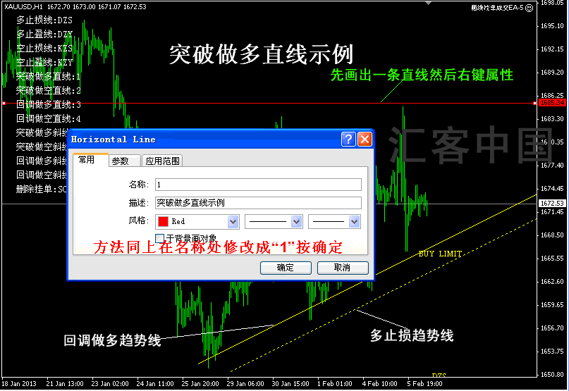 具體功能見軟件安裝后的局部截圖 畫出的趨勢線只要按圖中的數字命名就可以順利執(zhí)行掛單交易!