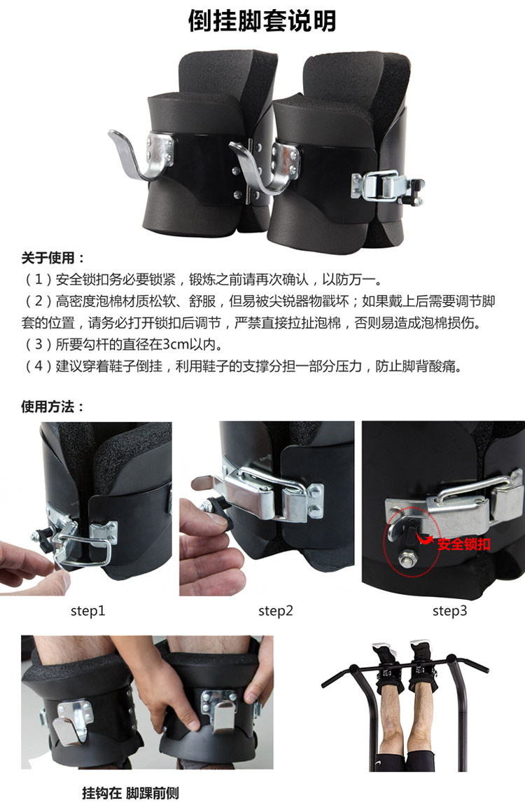 友情提醒:初次使用倒掛產(chǎn)品,建議身旁站一人輔助上下,并且對(duì)倒掛鞋使用環(huán)境進(jìn)行檢查,確保滿足安全需求。我們隨貨配送一根助力帶,用于輔助上下,請(qǐng)務(wù)必參照提示進(jìn)行運(yùn)動(dòng)操作。