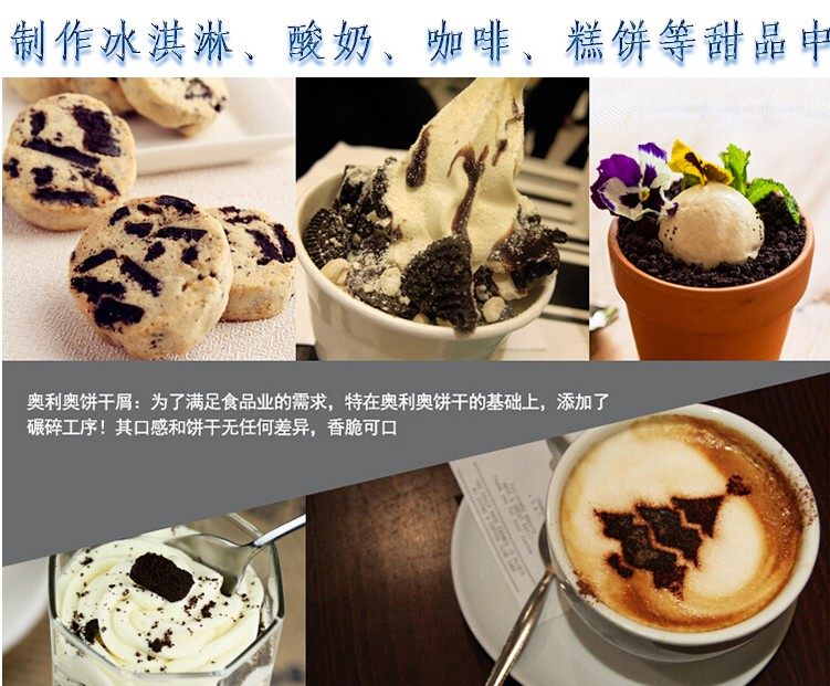 奧利奧餅干屑:為了滿足食品業(yè)的需求,特在奧利奧餅干的基礎(chǔ)上,添加了碾碎工序!其口感和餅干無任何差異,香脆可口。現(xiàn)階段主要用于制作飲品,在做卡布奇諾、拿鐵、奶茶、冰沙、冰激凌等飲品時,撒在上面,口感品質(zhì)佳!還可根據(jù)需求開發(fā)食品