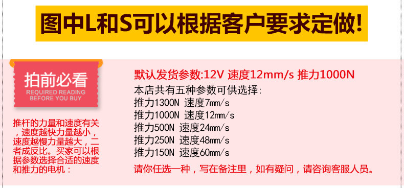 - 顏色分類(lèi):12V速度48MM/S推力25KG12V速度7MM/S推力130KG12V速度24MM/S推力50KG12V速度12MM/S推力100KG12V速度60MM/S推力15KG24V速度48MM/S推力25KG24V速度7MM/S推力130KG24V速度24MM/S推力50KG24V速度12MM/S推力100KG24V速度60MM/S推力15KG