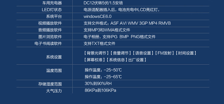 - 多媒體功能:音頻播放視頻播放電子圖片電子圖書游戲功能倒車后視