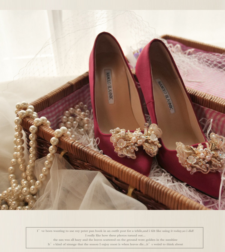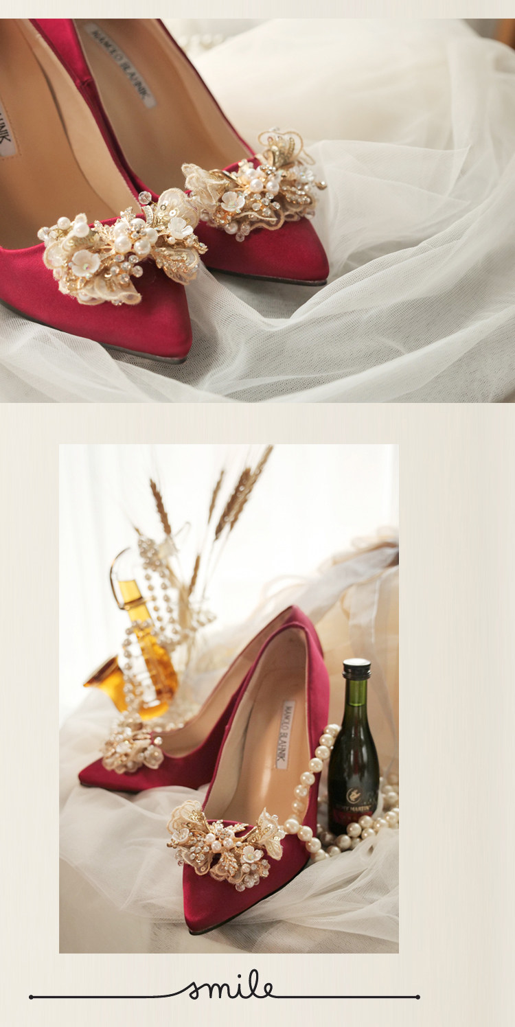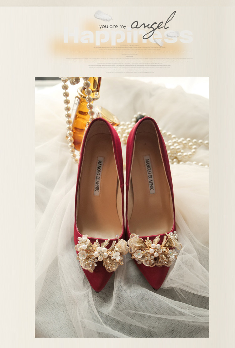 婚鞋女新款珍珠尖頭高跟鞋中式秀禾粗跟酒紅色結婚新娘鞋平底定制推廣熱賣行情
