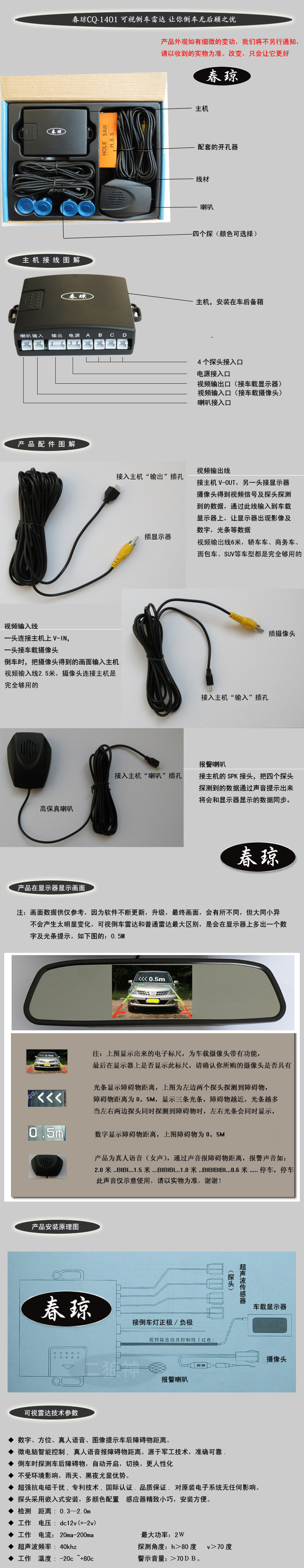 春瓊可視倒車?yán)走_(dá):非常新款春瓊CQ-1401可視倒車?yán)走_(dá)(顏色可選,套餐8、9、10、13、14配以下倒車?yán)走_(dá))