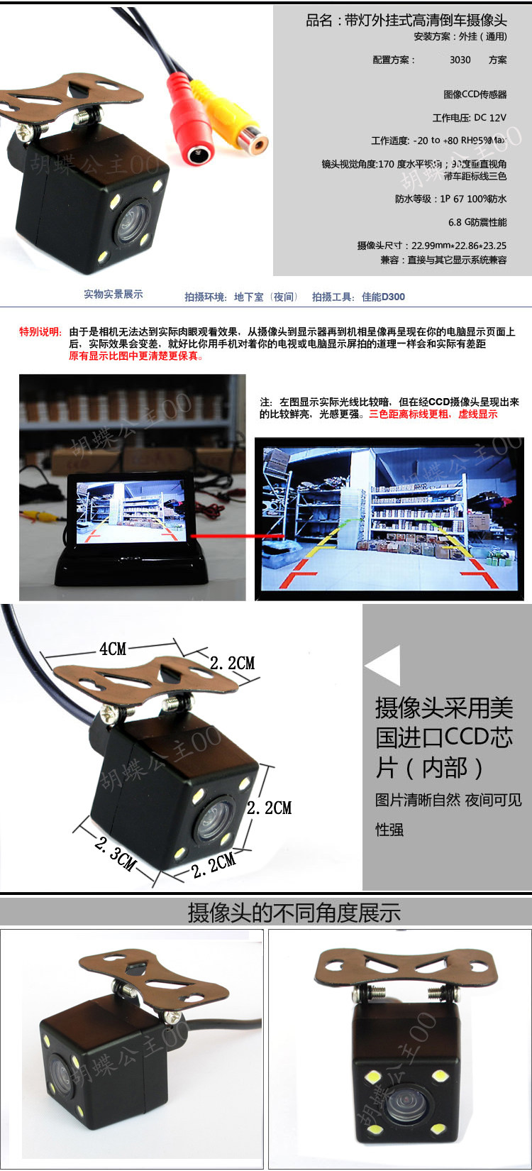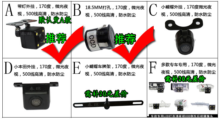 注:可選擇以下任意一款攝像頭,拍時告訴我們你需要哪款或留言備注,沒有說的發(fā)套餐默認(rèn)A款攝像頭,另外專車專用和車牌架攝像頭要貴(咨詢特價),需要拍下后客服改價!
