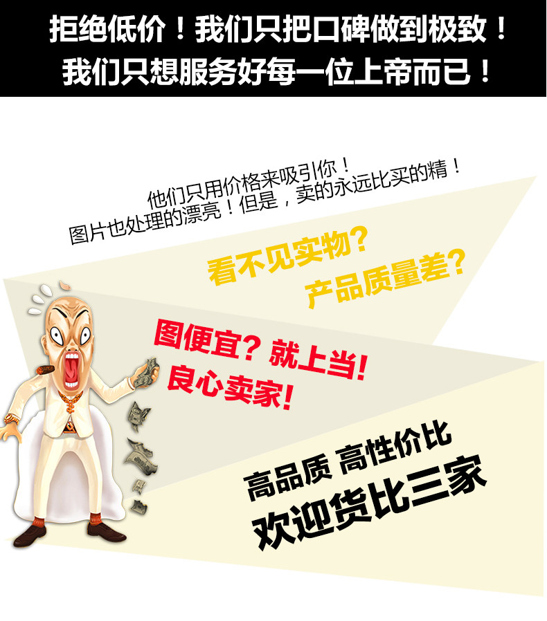 如果你覺得我們家的寶貝比別人家的貴了,請向各家免費(fèi)索取樣板對比一下,雖是雜市,“一分錢,一分貨” 始終是真理!