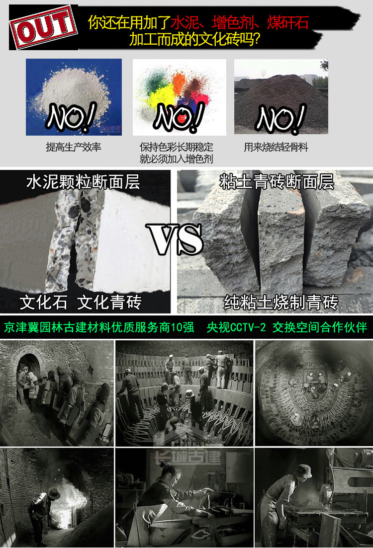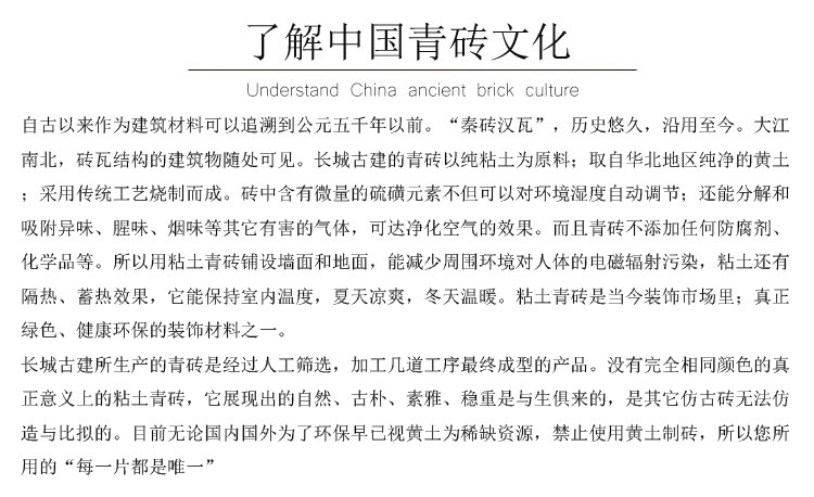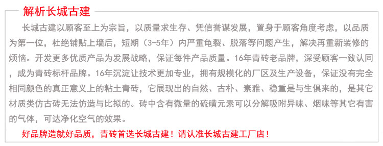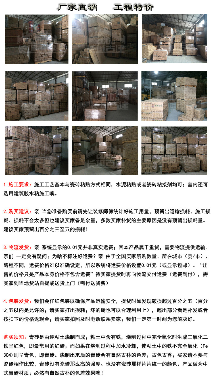 親們,如果你看出我們的產(chǎn)品與一些效果圖有些差別,那是正常的,由于青磚燒制工藝的特點(diǎn),產(chǎn)品本身每一片都彼此存在顏色的深淺差異,這款青磚需求的出現(xiàn)就是為了達(dá)到一種仿古的氛圍,滿足人們追求古樸自然仿古的視覺效果!