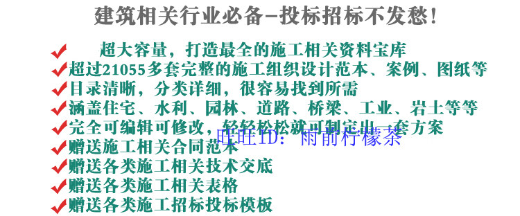 提供98G的施工組織設(shè)計(jì)范本、施工組織設(shè)計(jì)方案、鋼結(jié)構(gòu)工程設(shè)計(jì)及各類(lèi)施工相關(guān)資料,讓您終身?yè)碛蟹浅H氖┕は嚓P(guān)資料寶庫(kù),讓您投標(biāo)無(wú)憂(yōu)!施工無(wú)憂(yōu)!建筑相關(guān)行業(yè)必備-投標(biāo)招標(biāo)不發(fā)愁!