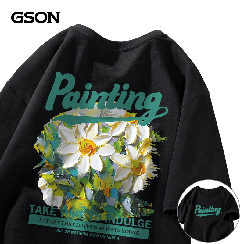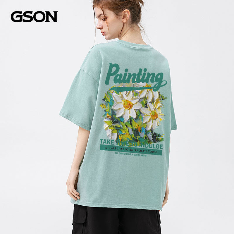 森馬集團(tuán)GSON短袖t恤男小眾設(shè)計(jì)感綠色菊花圖案大碼夏季男士半袖A推廣熱賣行情
