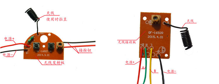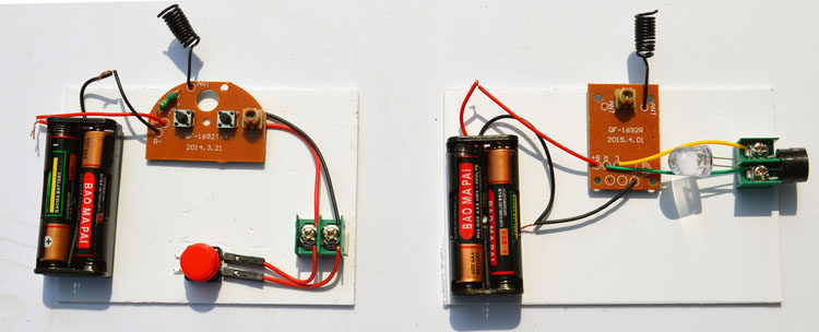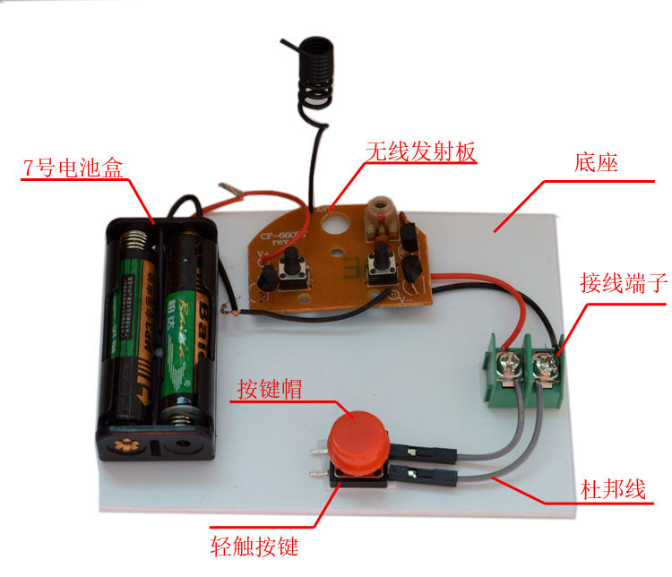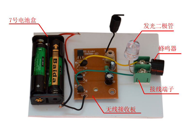 簡單的 無線電發(fā)報(bào)機(jī),能夠模擬莫爾斯電碼,簡單有趣,容易制作。通訊距離只有2-3米(天線拉直),只有一個(gè)固定頻率,不能做雙向通訊。(不提供其他的咨詢)。原理:按下發(fā)射按鈕后,發(fā)射板將會通過天線向外 發(fā)射固定頻率的無線信號。接收板的天線接收到無線信號后,使LED發(fā)光,蜂鳴器發(fā)聲。僅作為實(shí)驗(yàn)玩具用(沒有原理圖提供)