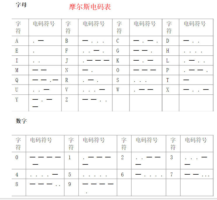 摩 爾斯電碼(又譯為摩斯密碼,Morse code)是一種時(shí)通時(shí)斷的信號代碼,通過不同的排列順序來表達(dá)不同的英文字母、數(shù)字和標(biāo)點(diǎn)符號。它由美國人艾爾菲德·維爾發(fā)明,當(dāng)時(shí)(1835年)他正在協(xié)助薩繆爾·摩爾斯進(jìn)行摩爾斯電報(bào)機(jī)的發(fā)明。 摩爾斯電碼是一種早期的數(shù)字化通信形尸但是它不同于現(xiàn)代只使用零和一兩種狀態(tài)的二進(jìn)制代碼,它的代碼包括五種: 點(diǎn)(.) 劃(-) 點(diǎn)和劃之間的停頓 每個(gè)字符間短的停頓(在點(diǎn)和劃之間) 每個(gè)詞之間中等的停頓 以及句子之間長的停頓