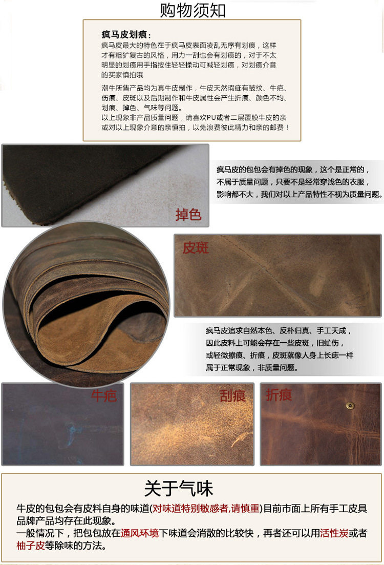 關(guān)于色差:全部都是實(shí)物拍攝,但每批牛皮都略有不同,買家需多多理解