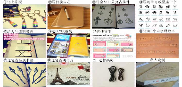 (咨詢特價(jià))尺寸13*10厘米全國(guó)包郵 (自帶3本本芯)+ 復(fù)古古銅掛件11只全送+替換本芯1本+大號(hào)純銅筆夾+PVC票據(jù)收納袋+復(fù)古金屬書(shū)簽+備用替換綁繩+復(fù)古明信片+免費(fèi)刻星座或刻生肖+免費(fèi)刻8個(gè)以內(nèi)英文字母+便簽本一本+使徒行者同款金扣七色泥一瓶