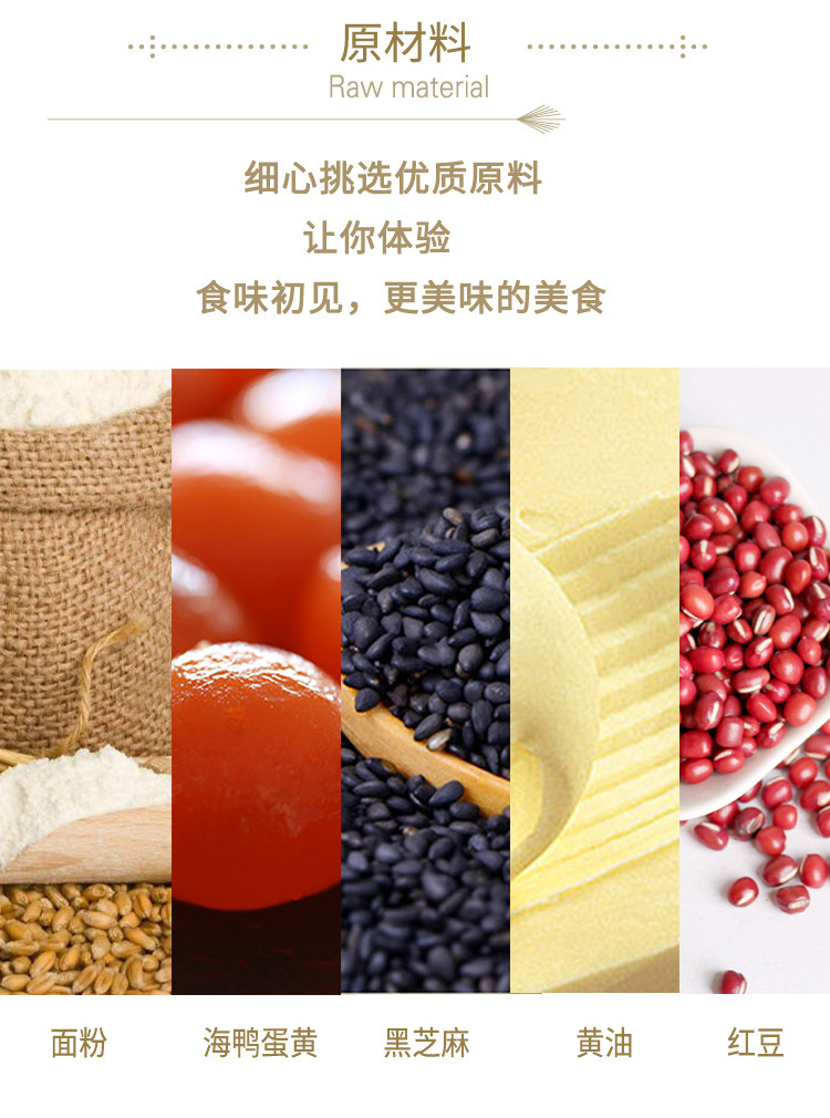 - 配料表:小麥粉、飲用水、黃油、白砂糖、海鴨蛋黃、紅豆餡、芝麻仁、食用植物油