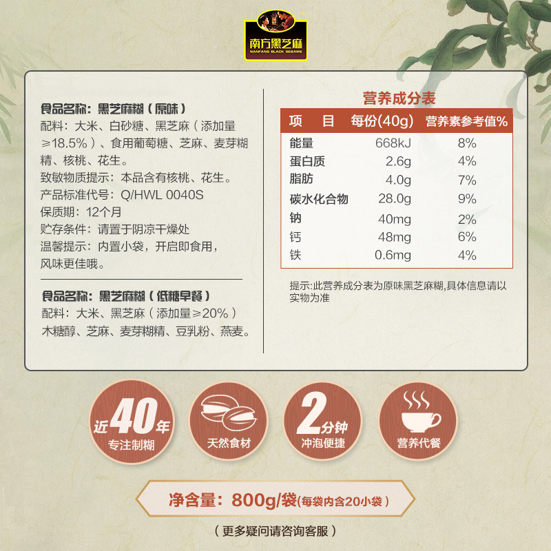南方黑芝麻糊原味800g即食沖飲沖調(diào)谷物營(yíng)養(yǎng)早餐代餐粉原味/低糖