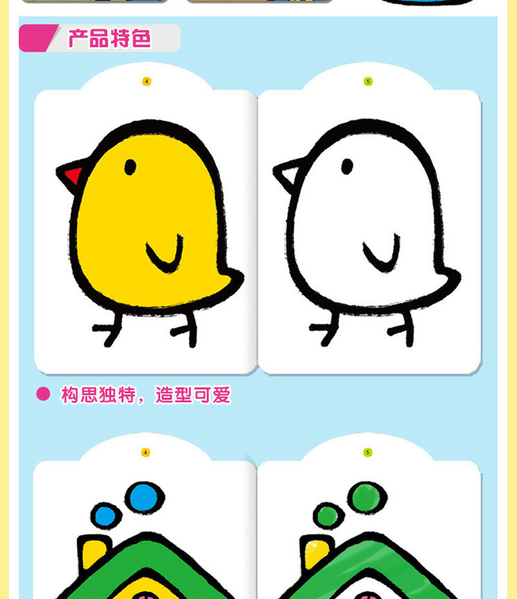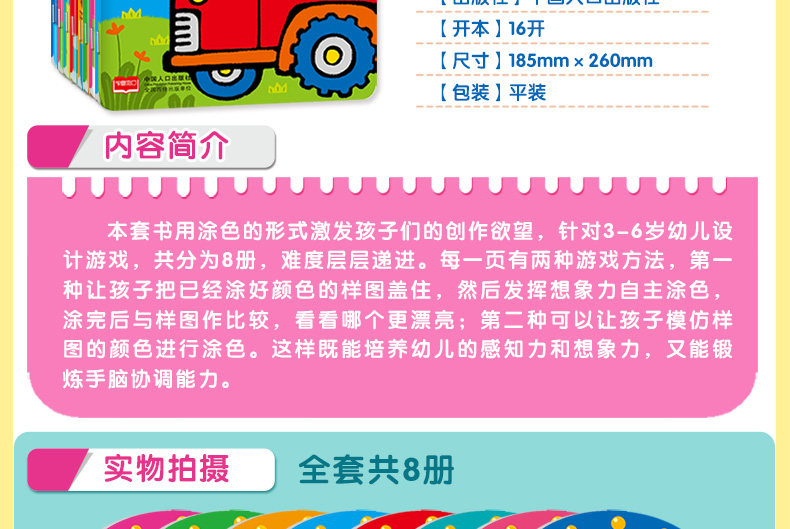 本套書用涂色的形式激發(fā)孩子的創(chuàng)作欲望,針對0-3歲幼兒設計游戲,共分為8冊,難度層層遞進。每一頁有兩種游戲方法,很不錯種讓孩子把已經(jīng)涂好顏色的樣圖蓋住,然后發(fā)揮想象力自主涂色,涂完后與樣圖作比較,看看哪個更漂亮;第二種可以讓孩子模仿樣圖的顏色進行涂色。這樣既能培養(yǎng)幼兒的感知力和想象力,又能鍛煉手腦協(xié)調(diào)能力。