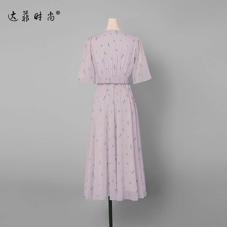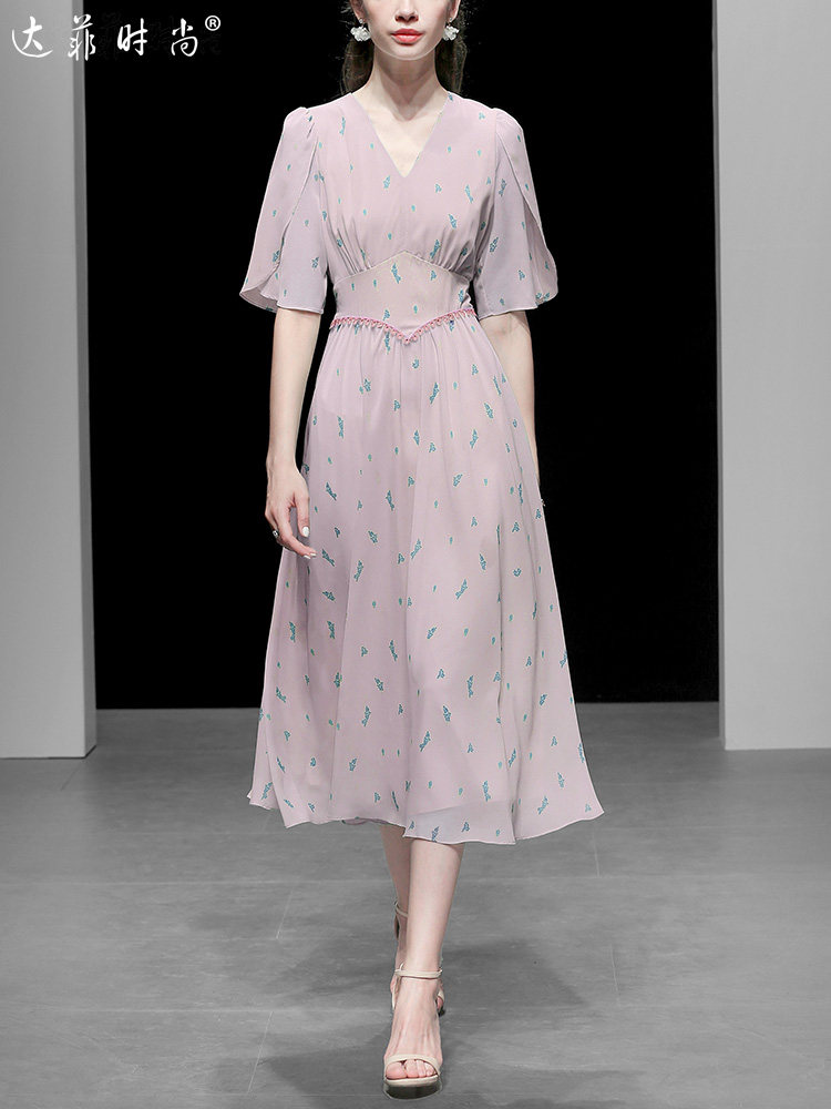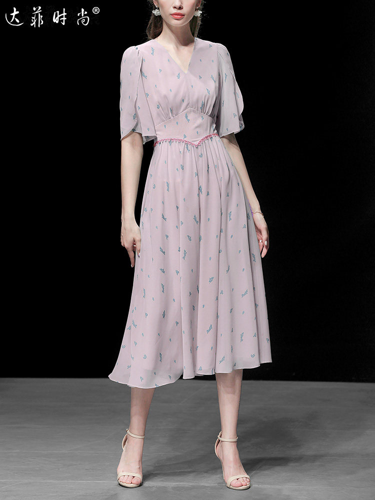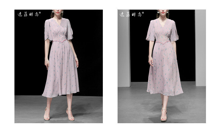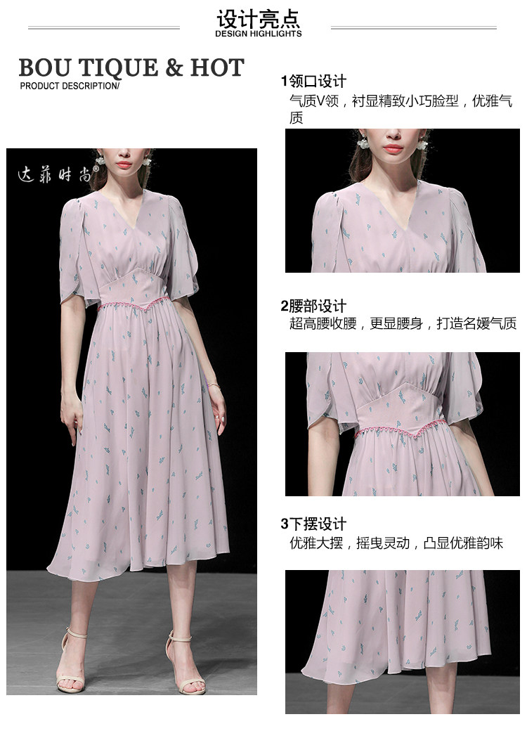 2021夏裝新款時(shí)尚復(fù)古V領(lǐng)花瓣袖印花雪紡連衣裙宮廷風(fēng)A擺傘裙推廣熱賣行情