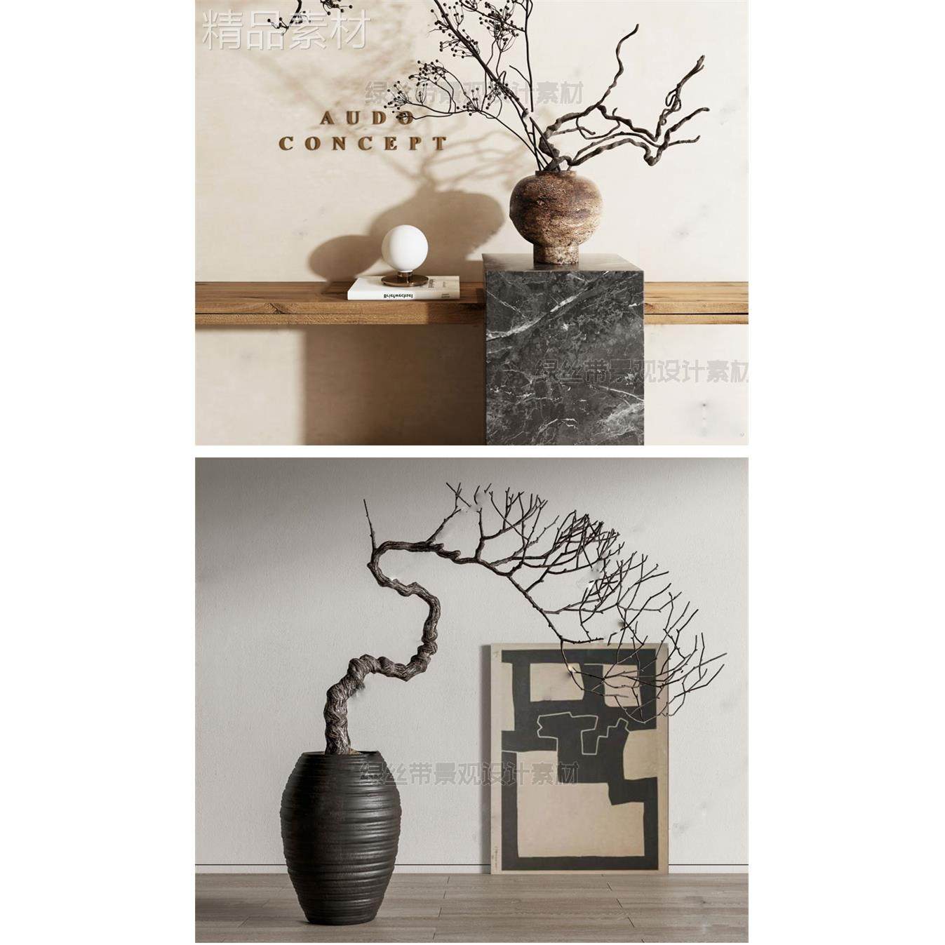 侘寂风陶罐摆件花瓶枯树枝干枝花艺室内小盆景绿植草图大师su模型价格行情